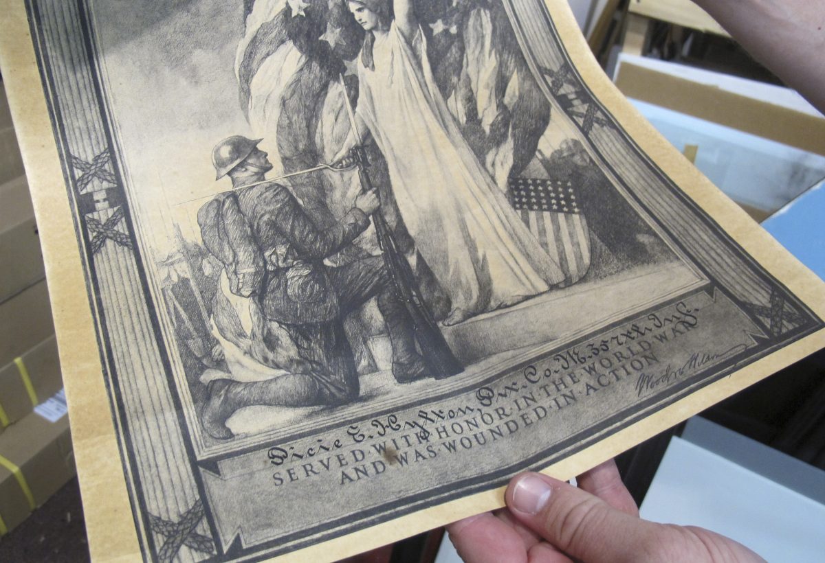 The lithographs, known as a Lady Columbia Wound Certificate and showing a toga-wearing woman knighting an infantry soldier on bended knee, were what World War I military members wounded or killed while serving were awarded before the Purple Heart came into being in 1932. World War I service members who already had a lithograph became eligible for a Purple Heart at that time.