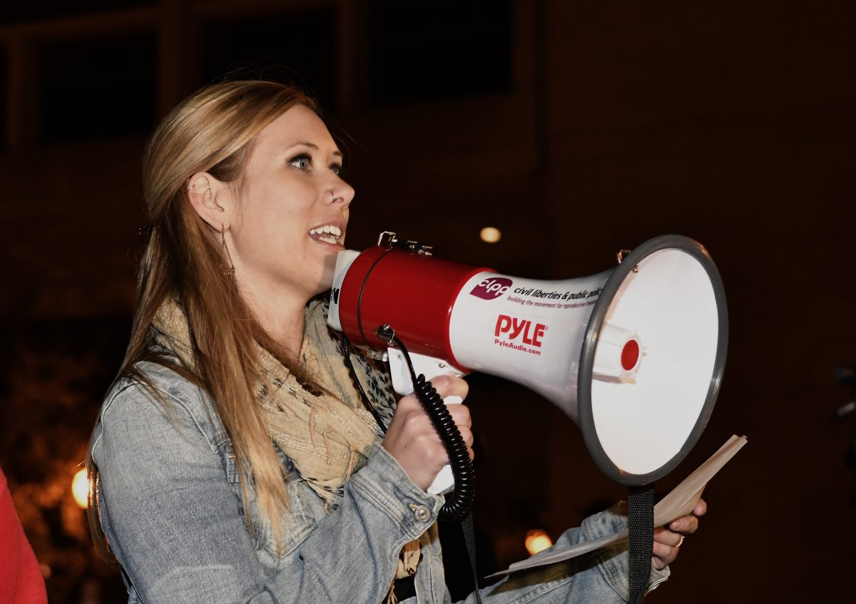 “As a white, queer person, we need unity with people of color, we need to stand up,” said Claire Bye, a 15-year-old sophomore at Academy High School. “I’m fighting for my rights as an LGBTQ person. I’m fighting for the rights of brown people, black people, Muslim people.”