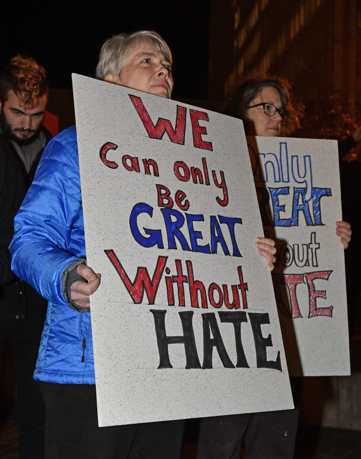 In Philadelphia, protesters near City Hall held signs bearing slogans like “Not Our President,” ”Trans Against Trump” and “Make America Safe For All.”