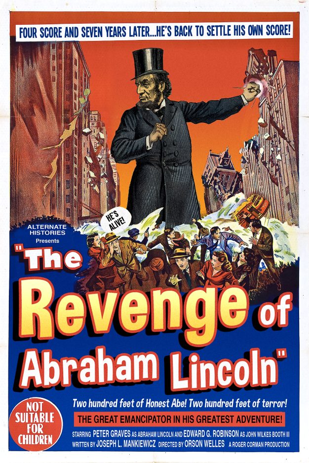 Then there’s a mock movie poster he created for a movie called “The Revenge of Abraham Lincoln,” which has the nation’s 16th president as a 200-foot tall monster “back to settle his own scores.” His “movie” stars Peter Graves and Edward G. Robinson and is directed by Orson Welles.