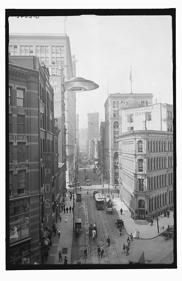 Fusing his fascination with history and his affection for Z-grade horror and science fiction movies from the 1950s and 1960s, Buchholz creates postcards, posters, greeting cards, and other material that feature ordinary historical images and scenes, but with surprising twists. For instance, he found a photo of High Street in Columbus, Ohio, taken in 1905 with carriages being pulled by horses and people nonchalantly going about their business. He added, just above the scene, a flying saucer. It is using, according to a description provided by Buchholz, an electro-ray transporter “rather than having to land on the rough-hewn, horse-trodden streets of the still-growing city.”