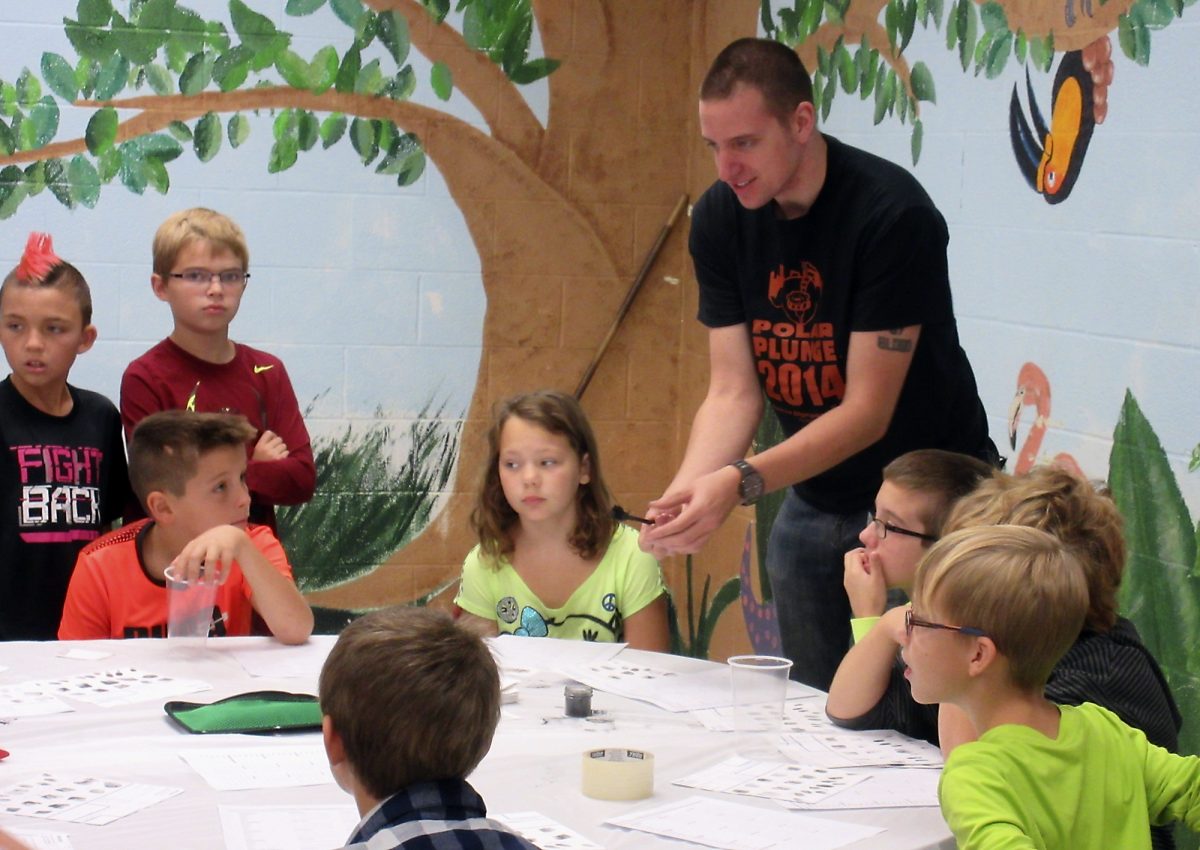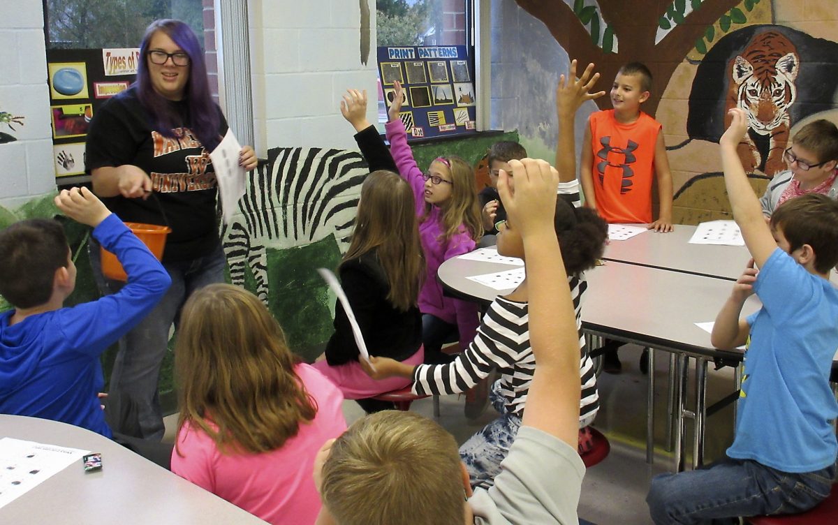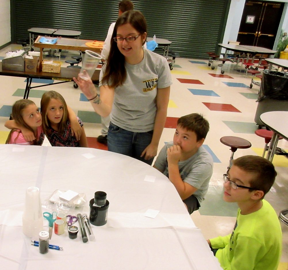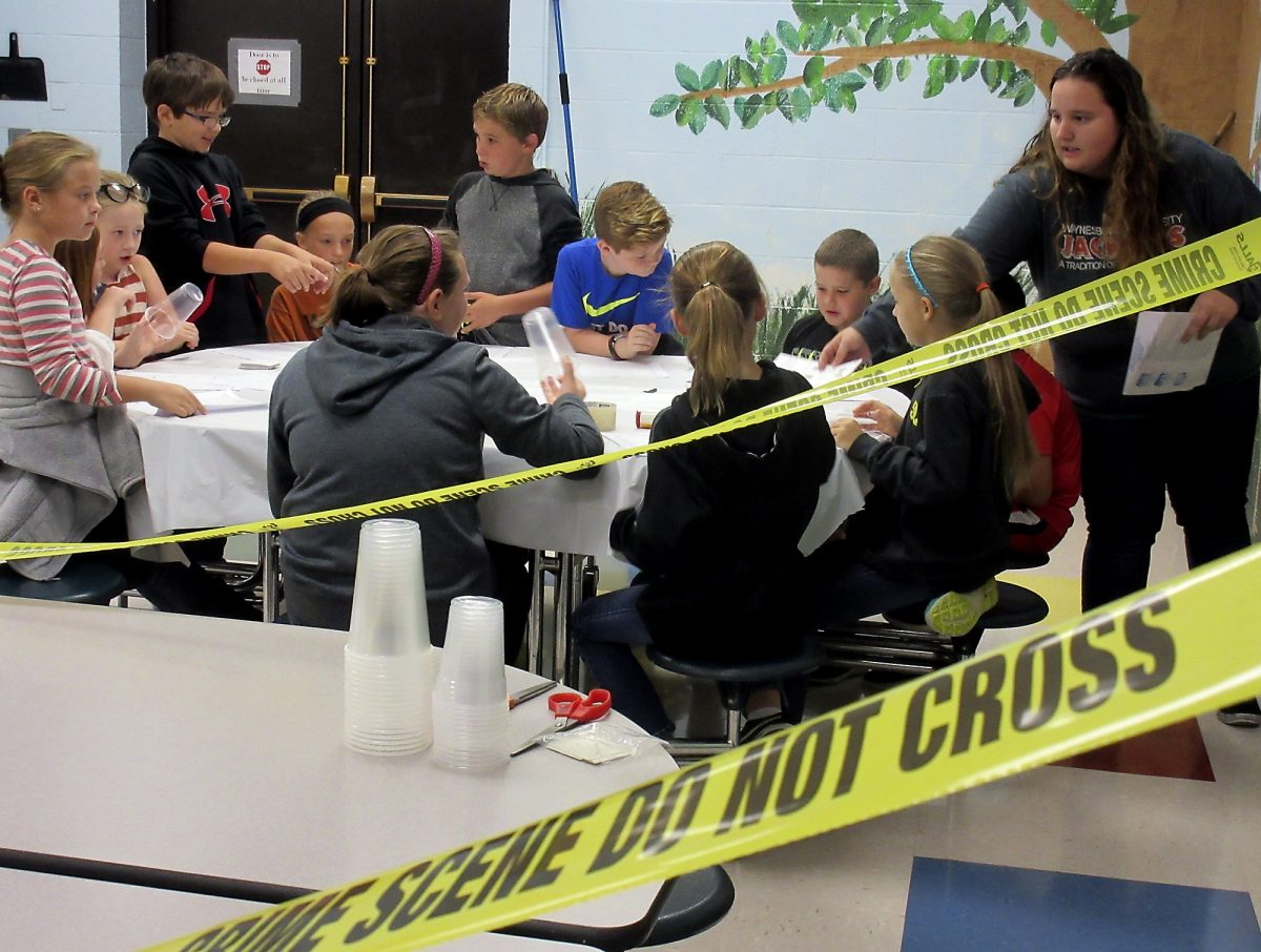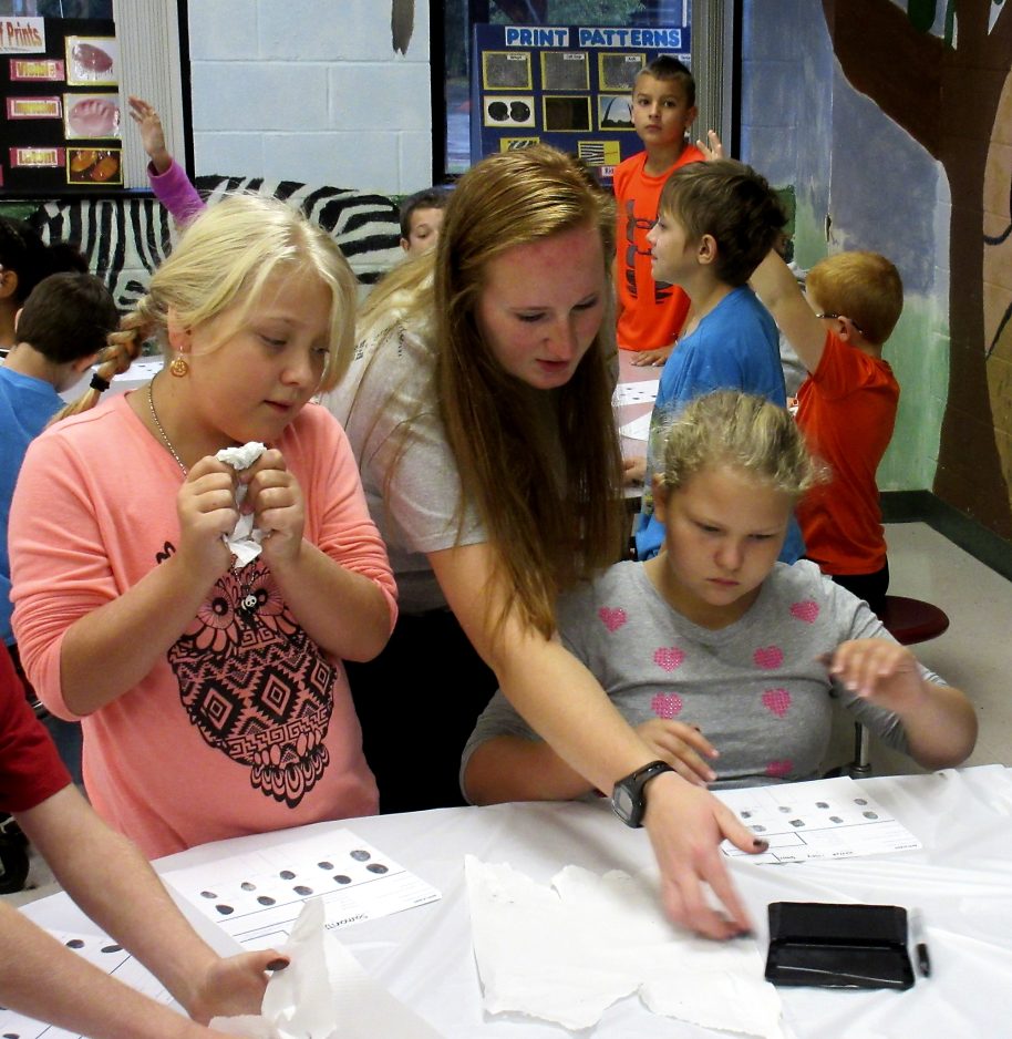 Waynesburg University students majoring in forensic science set up workshops to teach the elementary students about crime scenes and how to develop and lift fingerprints.