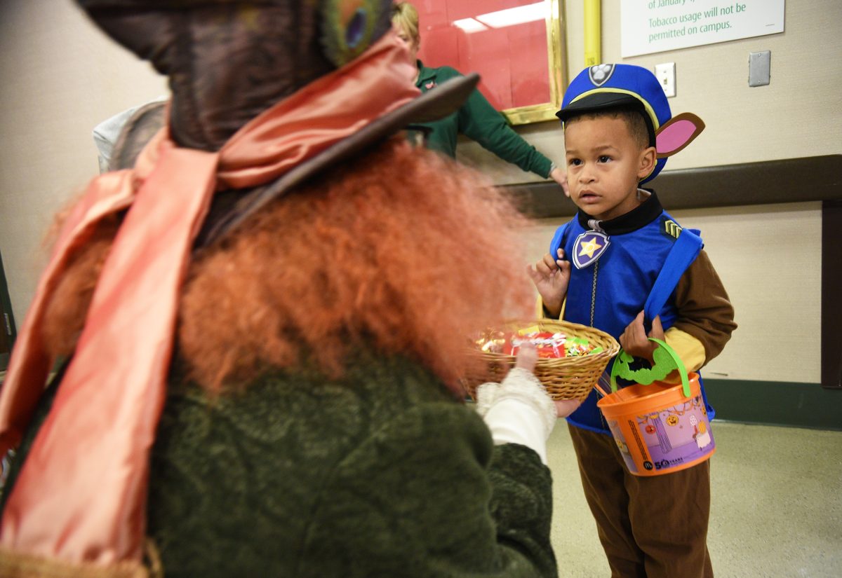 Carter Fuse, 3, of Canonsburg gets a piece of candy from the Mad Hatter during Canonsburg Hospital’s annual Halloween Trail. This year’s event was held inside because of weather Thursday.