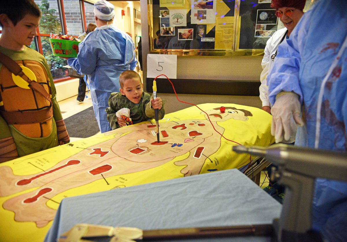 Christopher Creek, 7, of Washington tries his hand at a jumbo-sized Operation game during Canonsburg Hospital’s annual Halloween Trail Thursday.