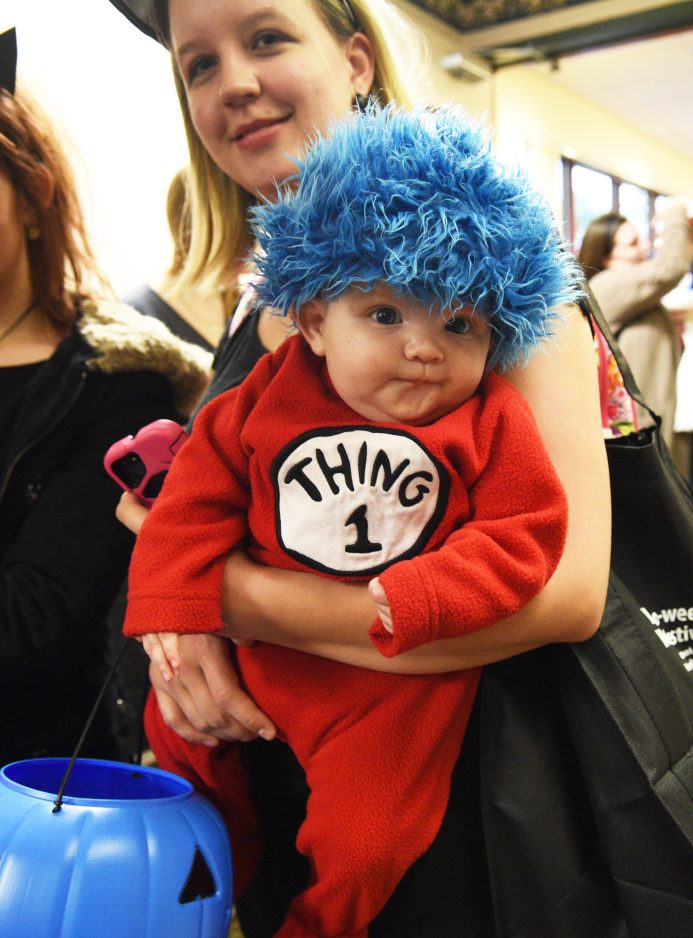 Catherine Zimmerman of Houston carries her 4-month-old son, Connor, as they gathered candy during Canonsburg Hospital’s annual Halloween Trail.