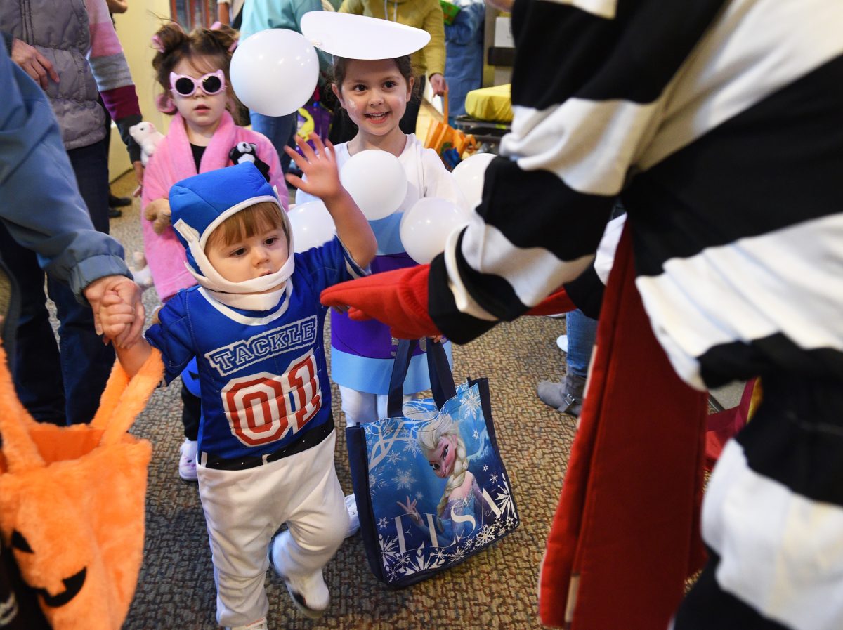 Silas Morgan, 1, high-fives Hamburglar as he and Liliana Capo, 5, both of Washington, gets a piece of candy Thursday during an annual Halloween Trail at Canonsburg Hospital.