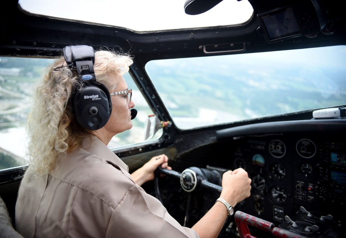 Ken Morris piloted a B-17 into Washington County Airport from Cincinnati, Ohio, Thursday, so his wife, Lorraine, took the controls for a 20-minute media jaunt to promote the plane’s local presence.