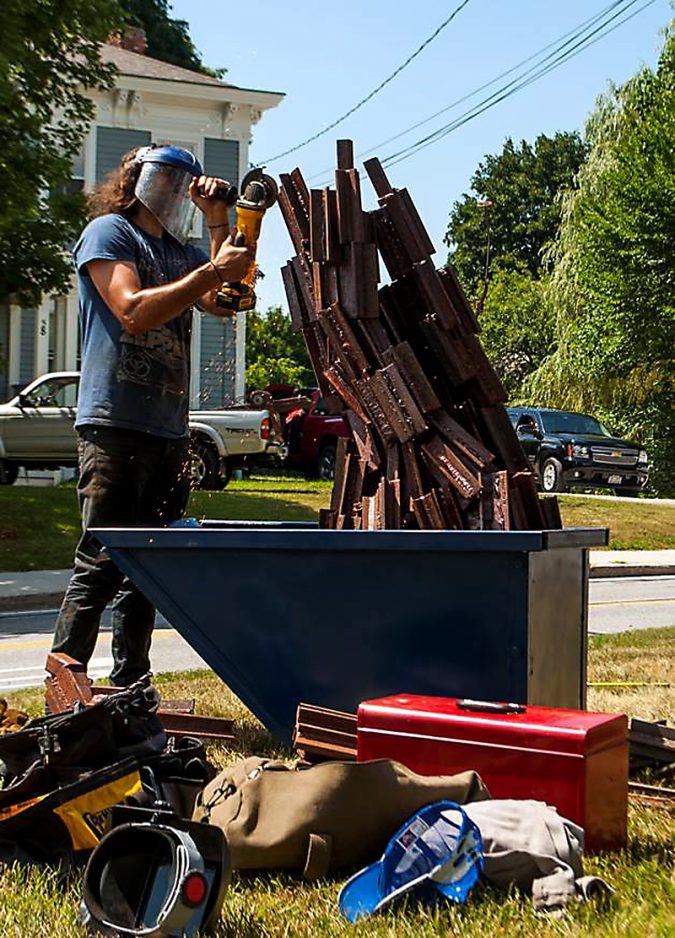 Along with his wife, Alison, Camut’s next step was to load the seven-foot, one-ton steel sculpture, plus tools, supplies and all the pieces that would require on-site assembly onto a trailer for an eight-hour trip to the North Bennington, Vt., Outdoor Sculpture Show.