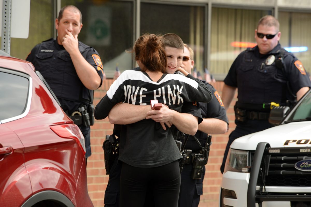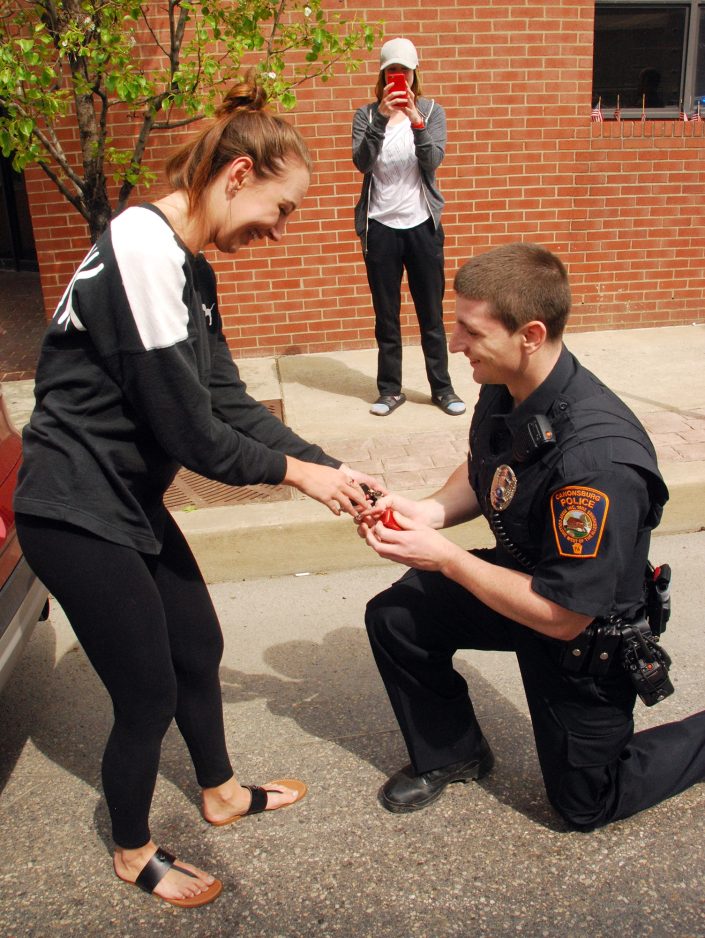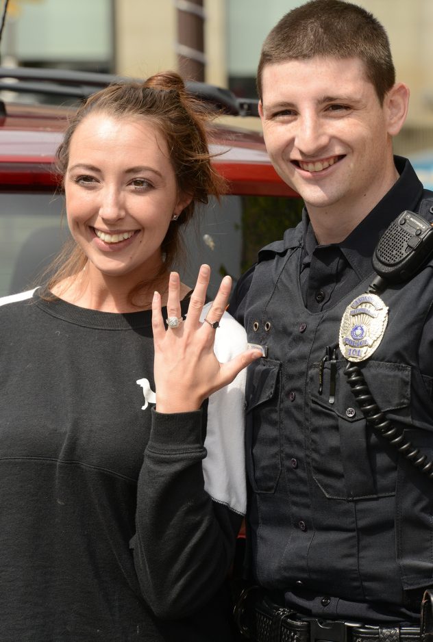 Angela Crump of Bethel Park proudly displays the engagement ring she just received from Canonsburg police Officer Eric Cersosimo. The couple met while in college at West Liberty and have been dating for three and a half years. Cersosimo’s fellow officers stopped Crump while she was on her way to deliver lunch to him Friday so that he could make his proposal on Pike Street.