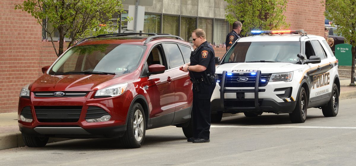 Canonsburg Officer Louis Bailey makes the initial traffic stop that gets Angela Crump’s attention so that fellow officer Eric Cersosimo can make his proposal Friday on Pike Street in Canonsburg.