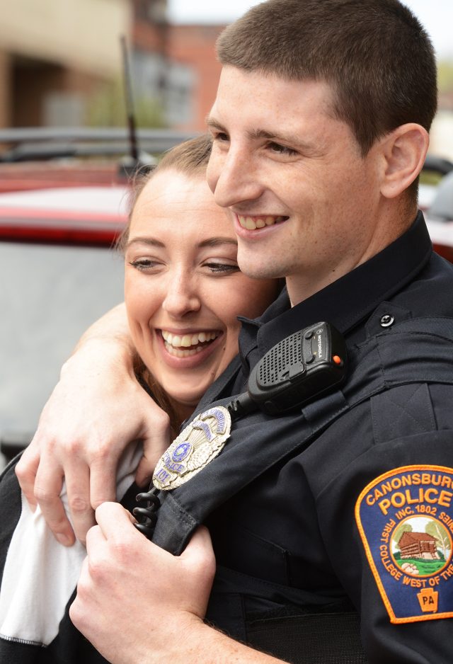 Angela Crump of Bethel Park responds with a resounding “yes” to Officer Eric Cersosimo’s proposal of marriage Friday. Fellow Canonsburg officers assisted in getting Crump’s attention by stopping her on Pike Street as she was driving to deliver lunch to Cersosimo.