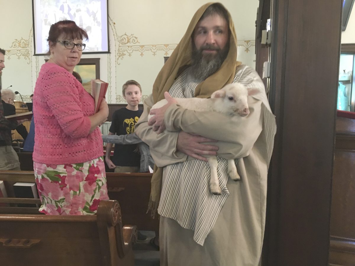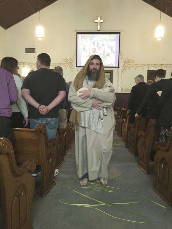 The congregation has a unique way of beginning Holy Week, which culminates in Easter. On Palm Sunday, Jason Mihal of Waynesburg, youth leader, dressed in the garb of a Middle Easterner and cradling a 3-week-old lamb in his arms, walked over palm branches spread upon the aisles of the sanctuary. Bleating and baa-ing, the orphaned lamb and the man who resembled a shepherd made their way through the crowd. It was a warm morning for early spring, and nestled next to Mihal’s voluminous garments, the lamb seemed to be quite uncomfortable, kicking the man who carried it.