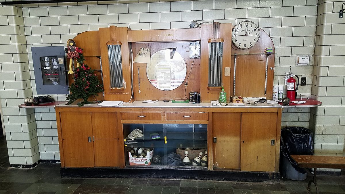 The six duckpin lanes in Donora nearly fill the first floor of the club, where there are two rows of benches for players and an Art Deco-style desk used by the person who manages the action.