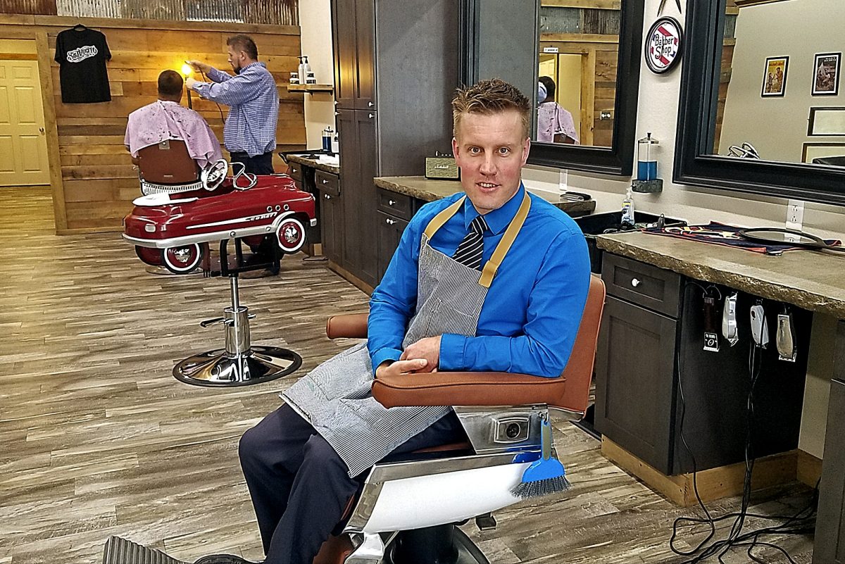 His shop in a former carpeting store at 105 W. Main St. has been given a complete makeover featuring walls lined with barn siding and rusting metal roofing. Two chrome barber chairs from the 1950s have been reupholstered and given new life there, and children can get their hair cut while seated in a chair fashioned out of a reproduction antique pedal car.