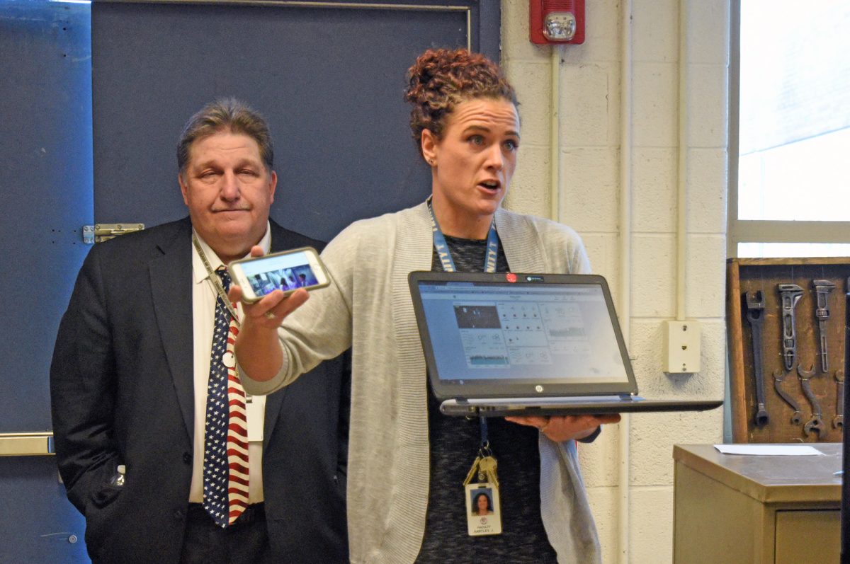 Trinity High School teacher Jeannette Hartley shows how she can access and control the Freight Farm from her phone or a laptop computer.