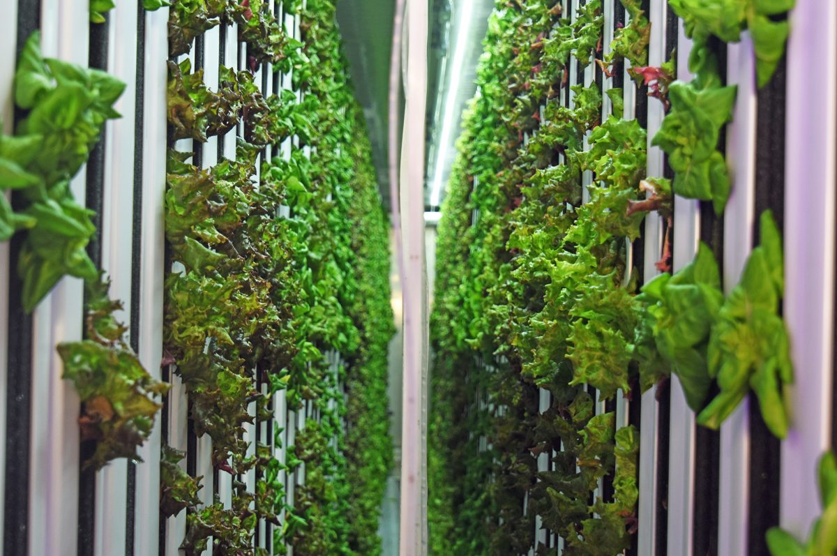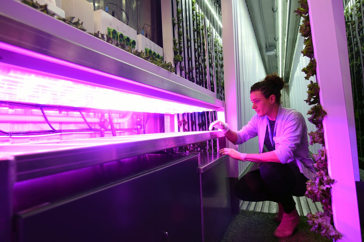 Regardless of the outdoor climate, conditions inside the 40-foot-long container (the equivalent of more than two acres) are ideal. LED lights simulate sunlight, and Hartley and her students can control the environment – light, heat, nutrients and water – with smartphones and laptops.