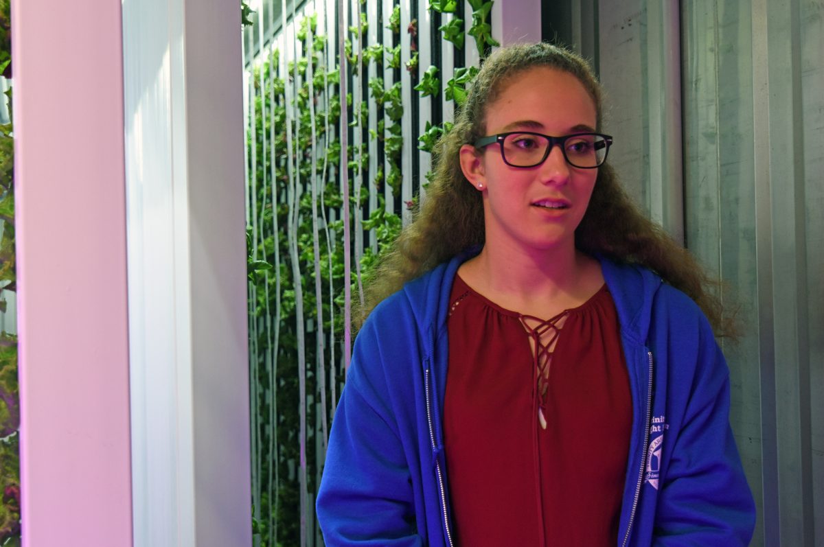 Cailey Dahlquist, a junior at Trinity and a member of the Freight Farm team, helps with planting, harvesting and maintenance.