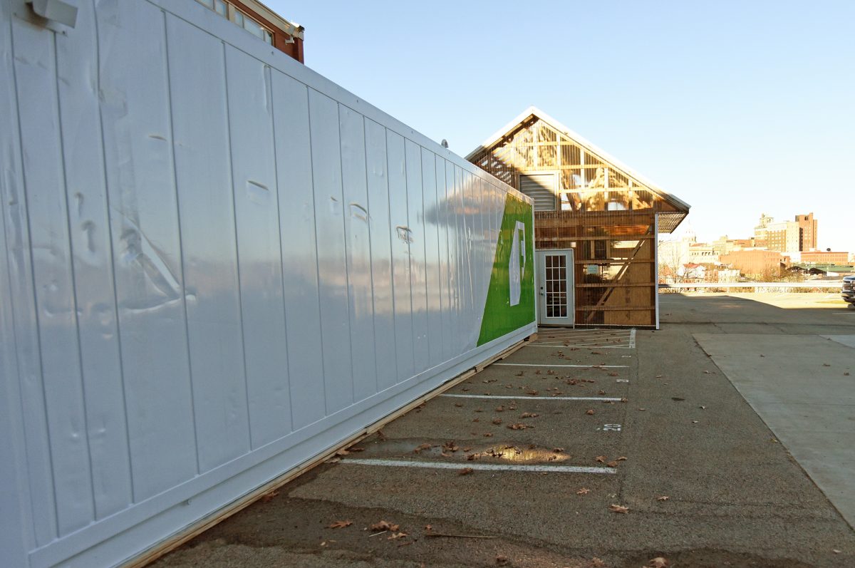 The Freight Farm and greenhouse outside Trinity High School in Washington