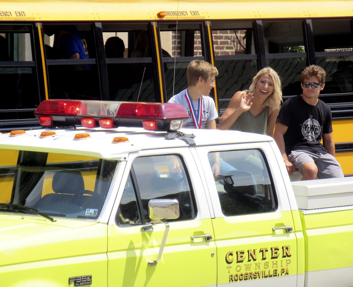 Waynesburg Central grad Marissa Kalsey, who won a Division III college championship while pole-vaulting at Westminster College this year, Ben Bumgarner, who won a state cross country title this year for Waynesburg Central, left, and Gavin Teasdale, a three-time state wrestling champion at Jefferson-Morgan, arrived on a Center Township fire brush truck before being honored.