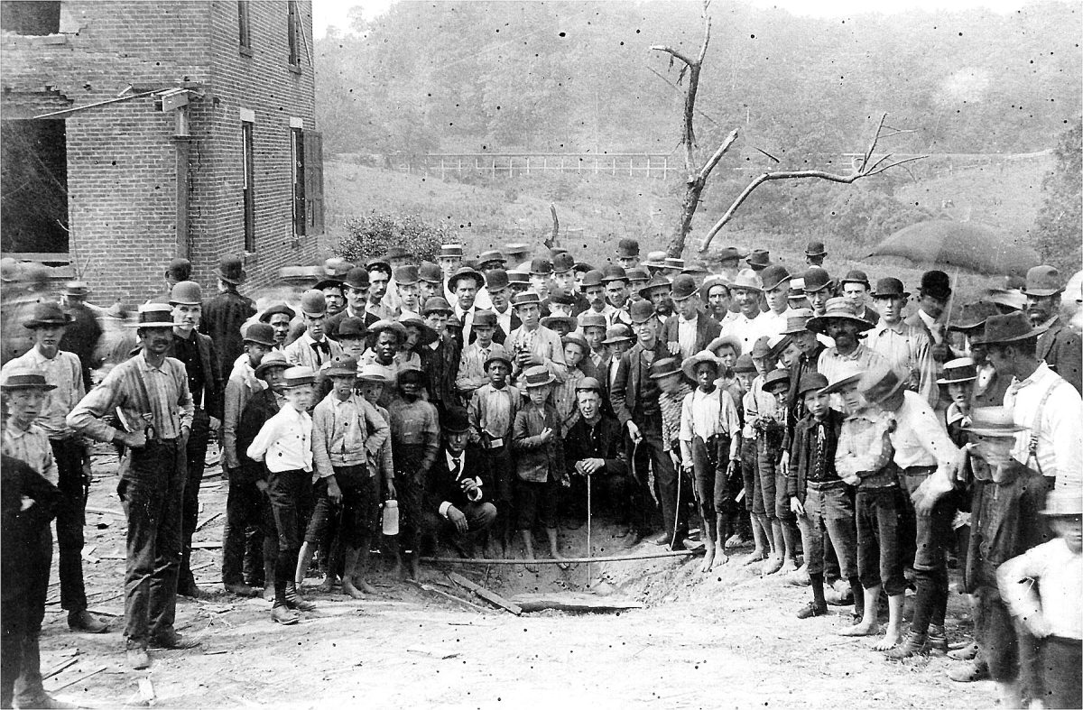 Worried that all evidence would be destroyed by the hundreds of souvenir hunters scrambling to the site, county Coroner T.R.H. Johnson hastily summoned an inquest. What remained of Sam Bigley was collected in a peck basket. The Saturday, July 18, edition of the Washington Reporter was precise in its grisly description of the contents, gathered from as far as 150 yards from the crater. Under a headline reading “Shreds of Quivering Flesh,” the article stated: “Among the parts found were two pieces of scalp, with the ear attached to one, two pieces of jaw with teeth, some of the flesh of the neck being attached to one piece, a part of the backbone, a piece of rib, a finger and the tongue with that part of the lip with the moustache.”