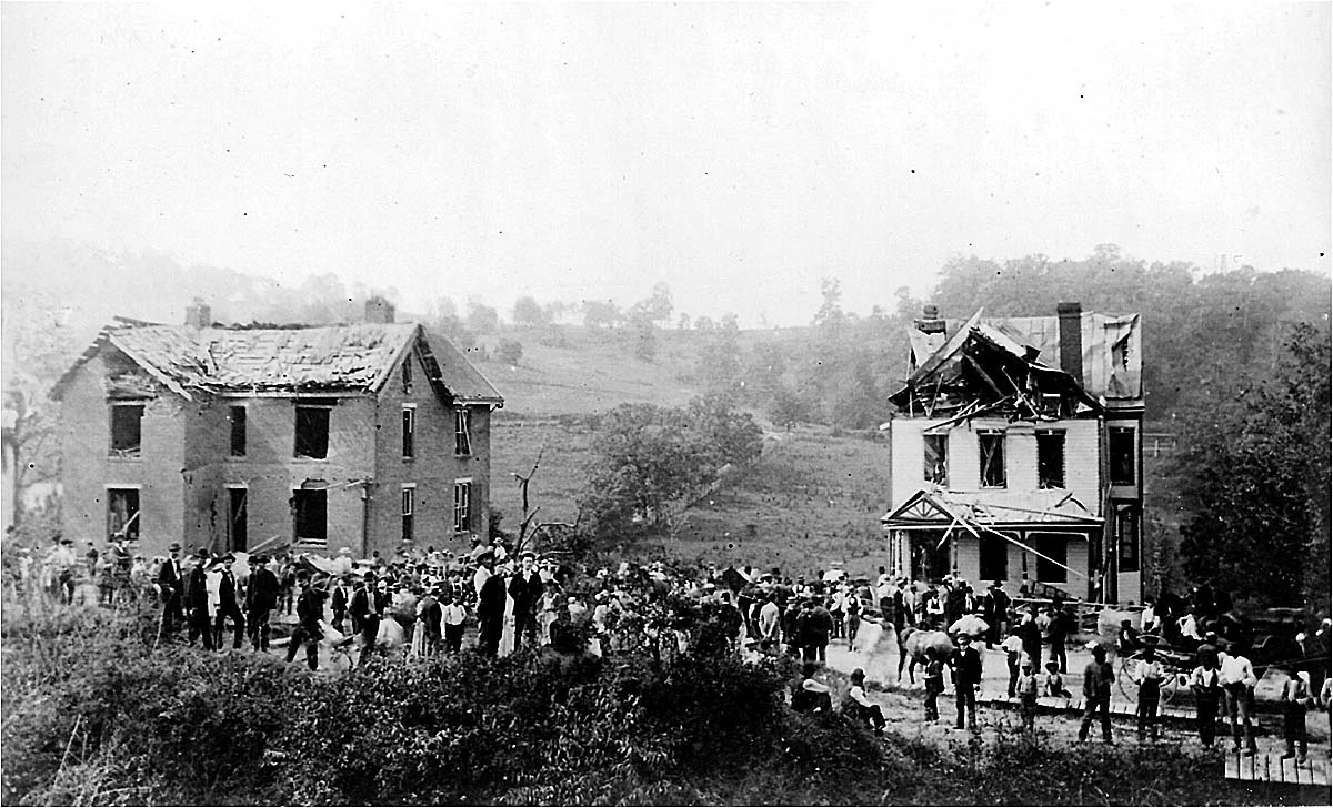 Nearby trees were stripped of all their leaves. Telegraph poles were broken, their wires twisted. The ground was littered with birds killed by the concussion. It would take about 38 seconds for the concussion of the blast to reach Canonsburg, where windows rattled and heads turned in the direction of Washington. About the same time, as S.B. Post was mowing a field of hay in East Finley Township, eight miles away, the force of the explosion jarred the seat of his mower and startled the horses so much that he had difficulty keeping them from bolting.