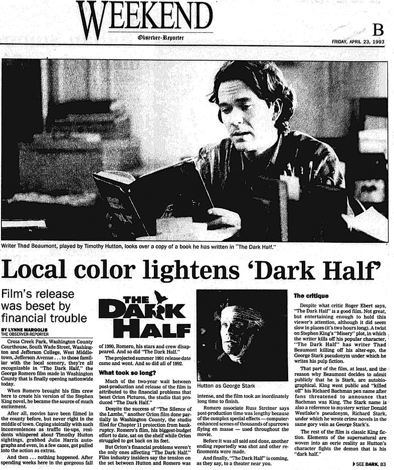 When the production left Washington County in November 1990, reports about “The Dark Half” stopped. The film was not released until April 23, 1993, despite an initial expected summer 1991 release date.