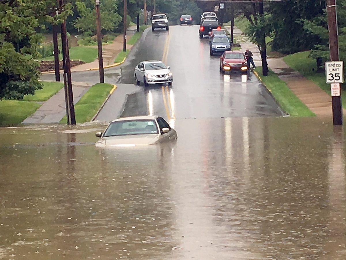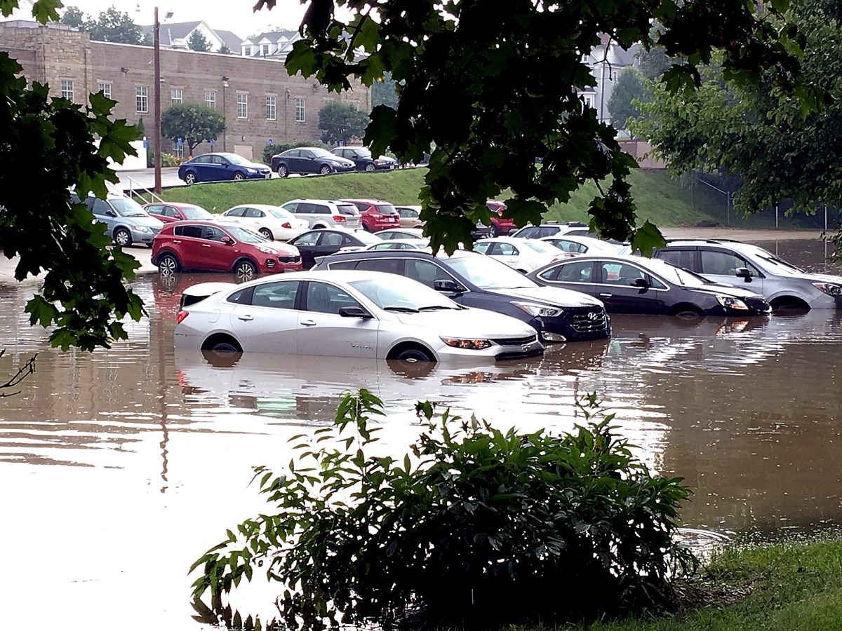 A portion of East Beau Street in Washington was closed between North Avenue and College Street, where stormwaters flooded more than a dozen cars in a parking lot below Church of the Covenant about 5 p.m.