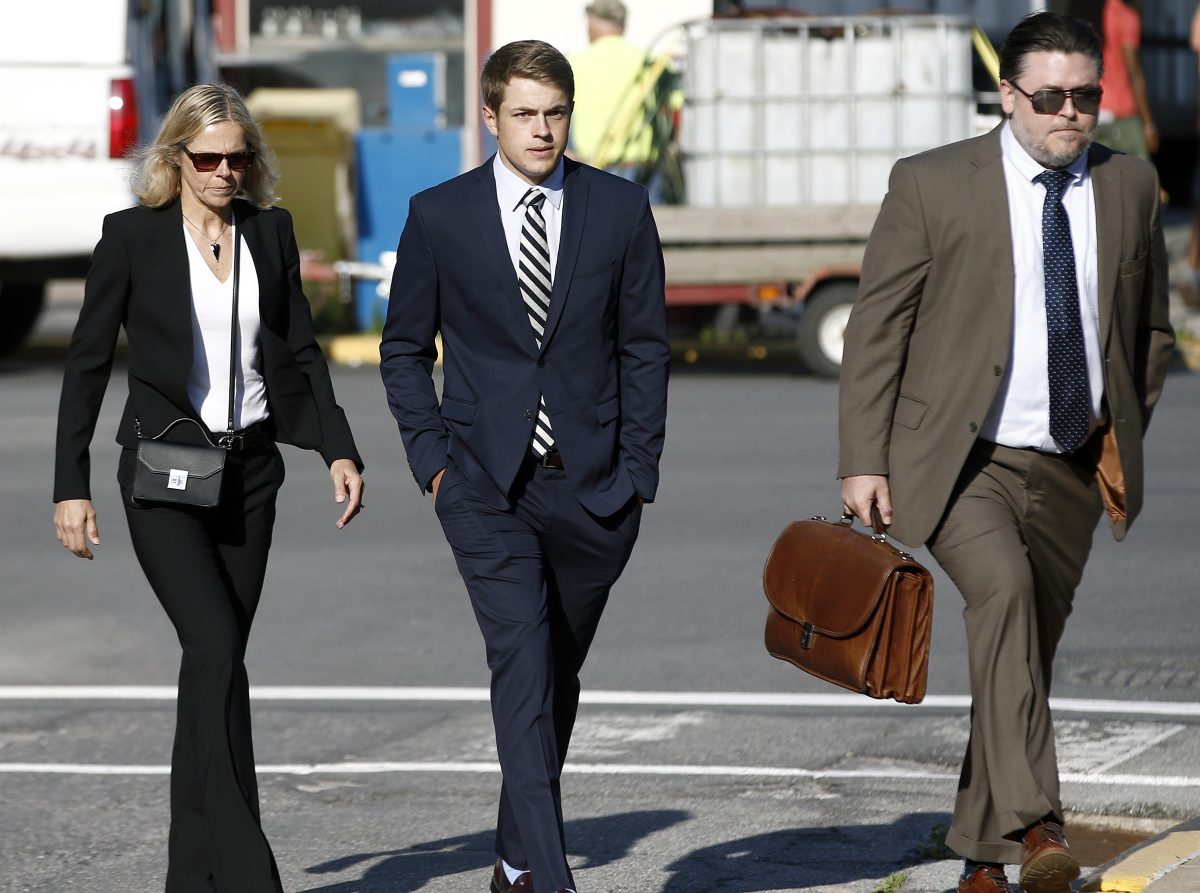 Lars Kenyon, center, arrives for his preliminary hearing on charges related to the hazing death of Timothy Piazza at Penn State’s Beta Theta Pi fraternity at the Centre County Courthouse in Bellefonte Monday.
