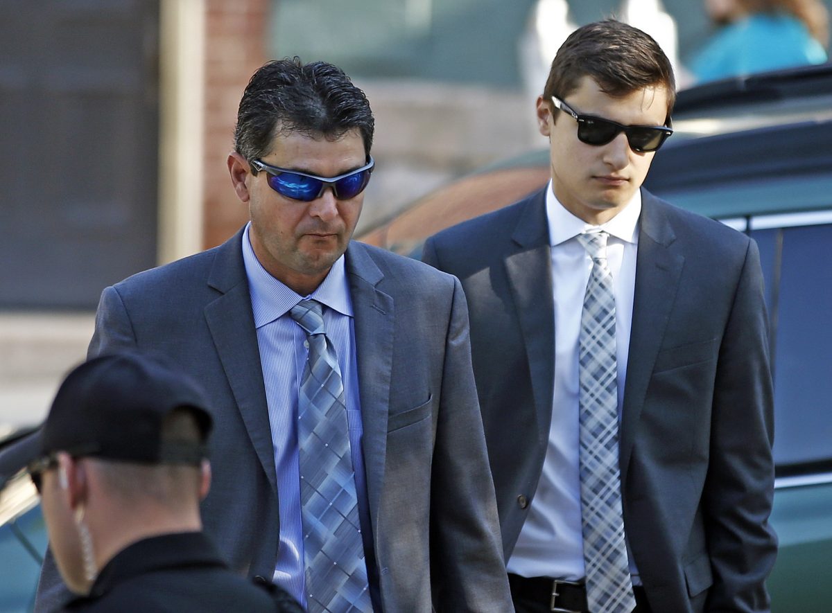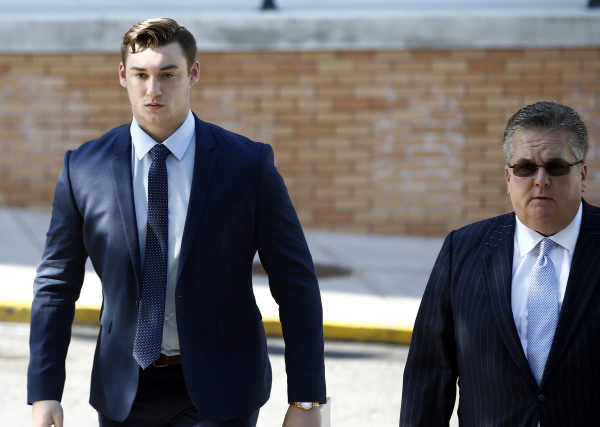 Joe Sala, right, arrives for his preliminary hearing on charges related to the hazing death of Timothy Piazza at Penn State’s Beta Theta Pi fraternity at the Centre County Courthouse in Bellefonte Monday.