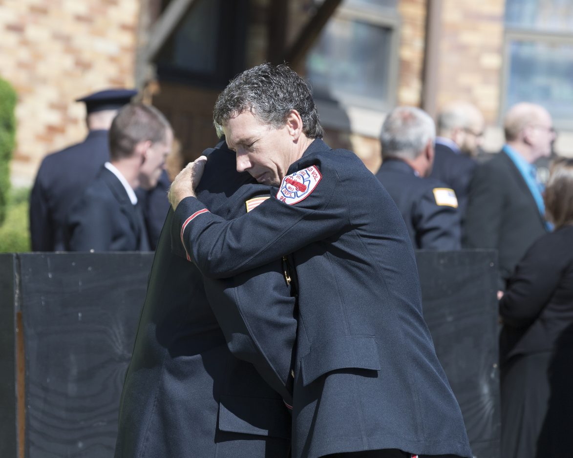 Colleagues of McDonald fire Chief Scott Albertini embrace Monday before Albertini’s funeral at McDonald Presbyterian Church. Albertini was killed last week in an industrial accident in West Virginia.