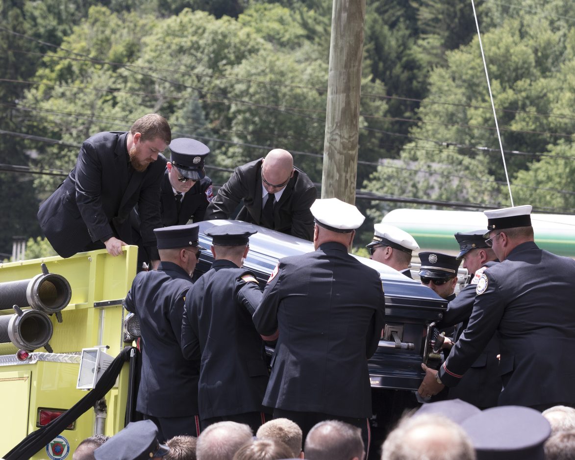 Pallbearers place the casket of McDonald fire Chief Scott Albertini on a fire truck Monday. Hundreds turned out for the funeral of Albertini, who was killed last week in a West Virginia industrial accident.