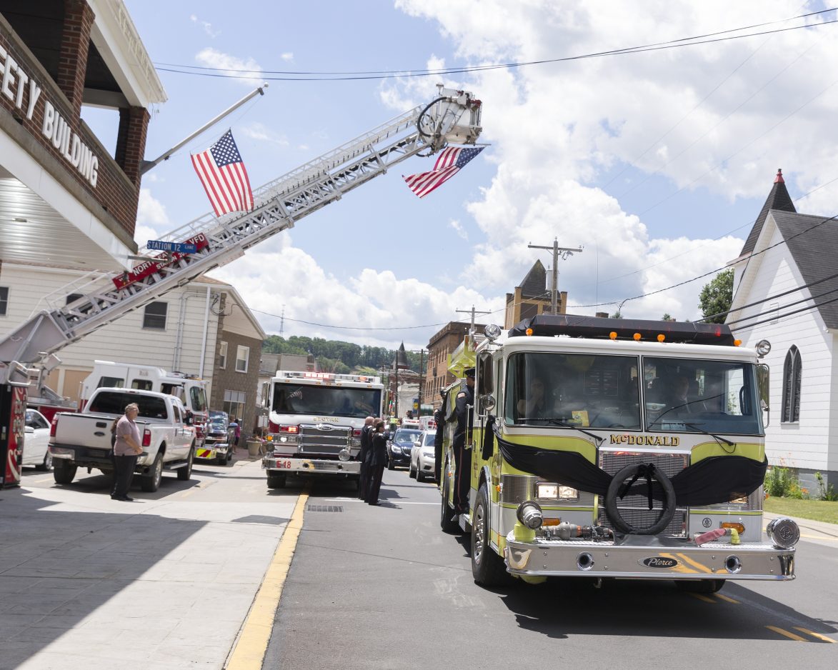 The funeral procession of McDonald fire Chief Scott Albertini moves through the town Monday. Albertini, who had been with the fire department in various capacities since 1982, was killed in an industrial accident in West Virginia last week.