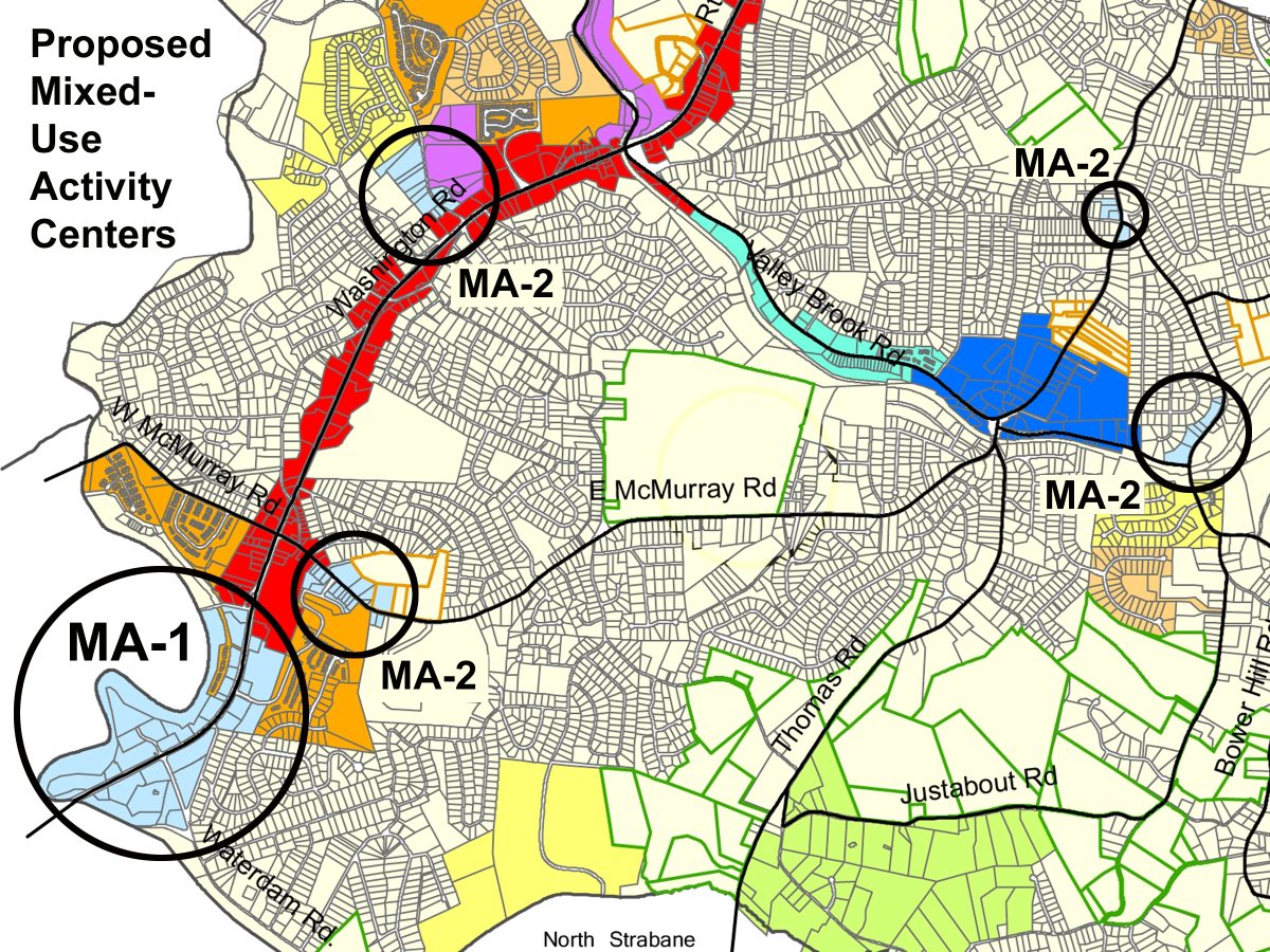 As proposed, Mixed-Use Activity Center zoning would apply to five areas of the township, the largest of which would be along Route 19 southwest from McDowell Lane, with a unique designation as MA-1. Smaller areas, designated MA-2, are located at:
