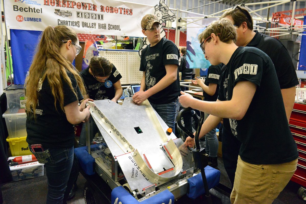Chartiers Valley High School students Clair Malone, Abby Chidlow, Ryan Crown, Jack Radzanowski and Chris Wilson converge on their robot as it is wheeled back into the pit area between rounds last year at the competition.
