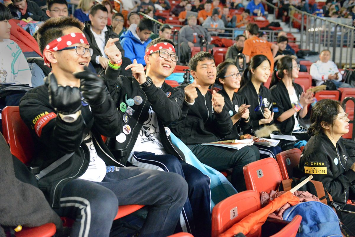 During last year’s competition, the GOLEM team from Shenzhen, China, cheers from the stands at the Greater Pittsburgh Regional FIRST Robotics Competition at California University of Pennsylvania.