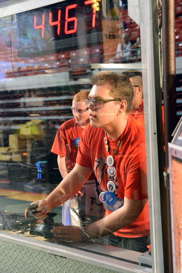 Ethan Schrim watches intently as driver Stephen Patrick steers the Titanium Titans’ robot from behind the safety glass that surrounds the competition floor. Each round included a segment during which the robot had to operate autonomously, and finished with the team member operating the controls remotely.