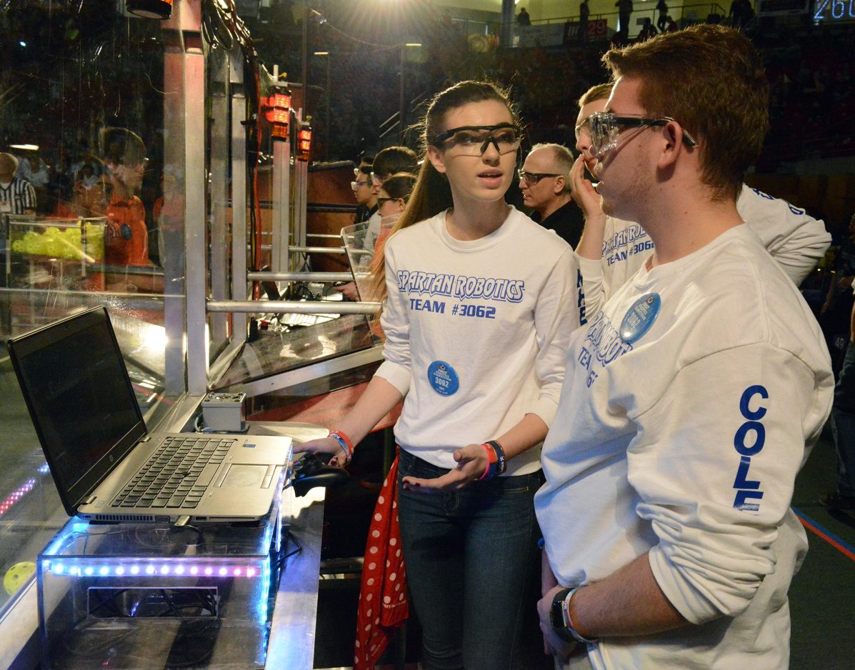 Titanium Titans team members Adam Robertson, Luke Markinos, Jesse Wolfe and Meghan Black make last-minute adjustments to their machine between rounds at last year’s FIRST Robotics Competition.