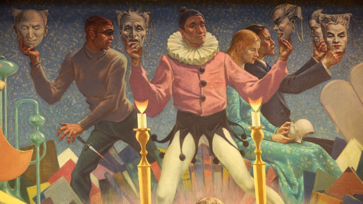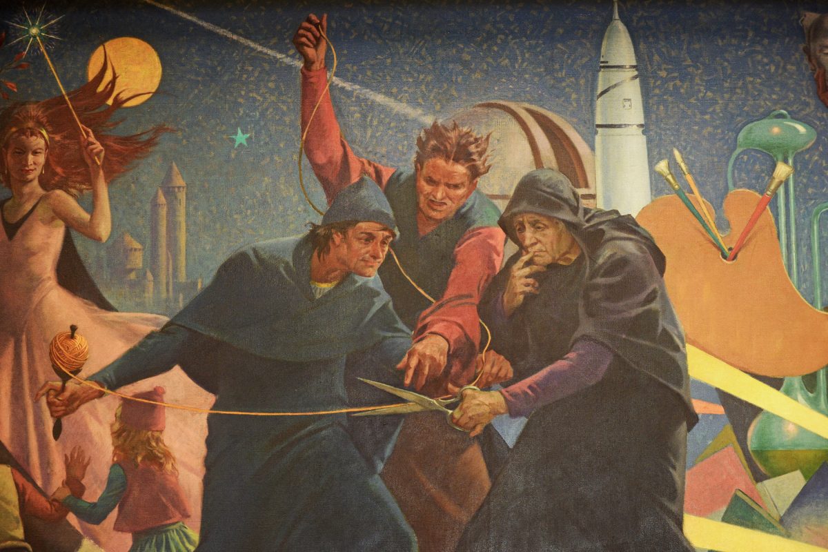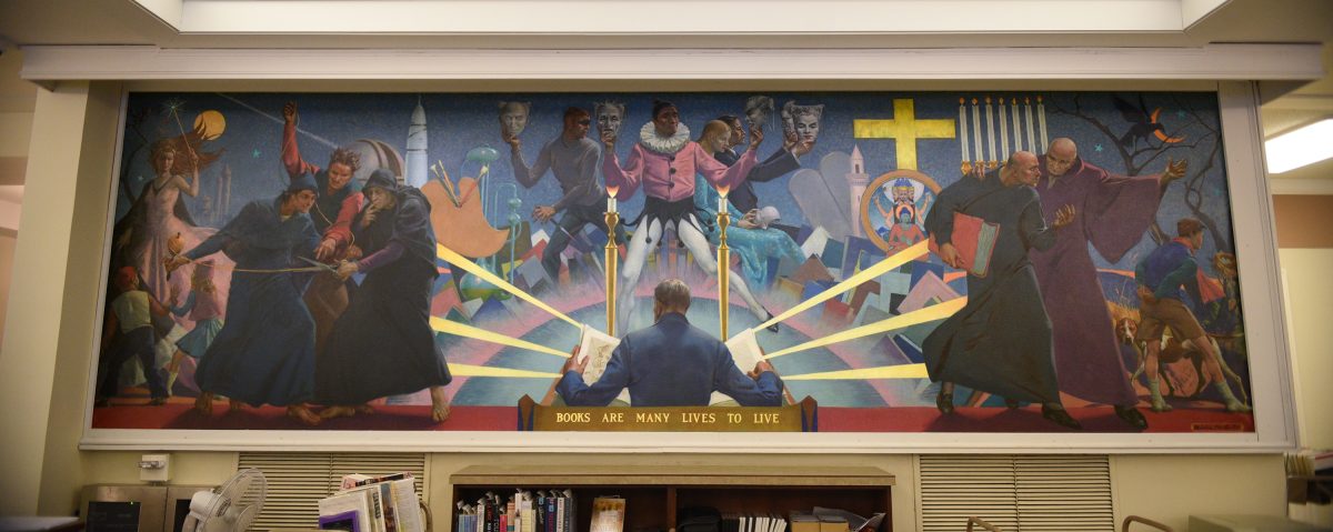 The large mural behind the circulation desk at Citizens is Parcell’s “Books Are Many Lives to Live” – one of his mythologies. It is an 18-foot by 5 ½-foot work commissioned by the Fitch family for the opening of the new library building in 1965. The mural has a local flavor.
