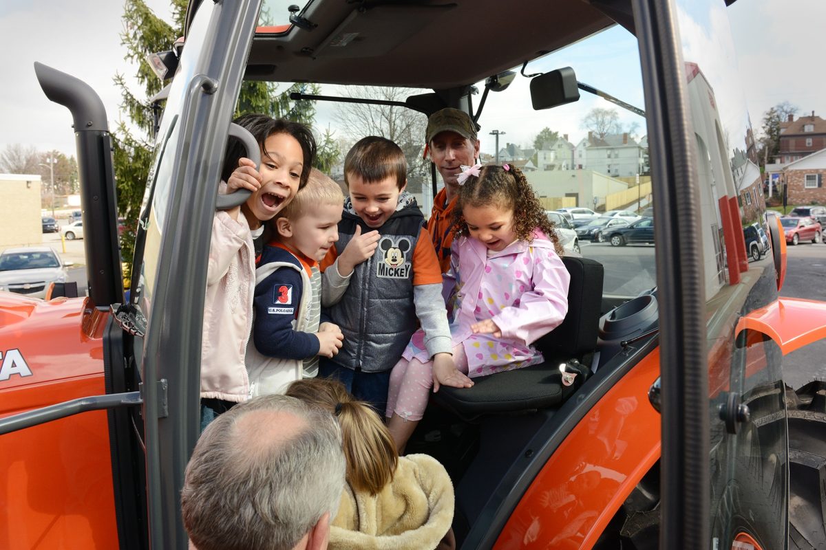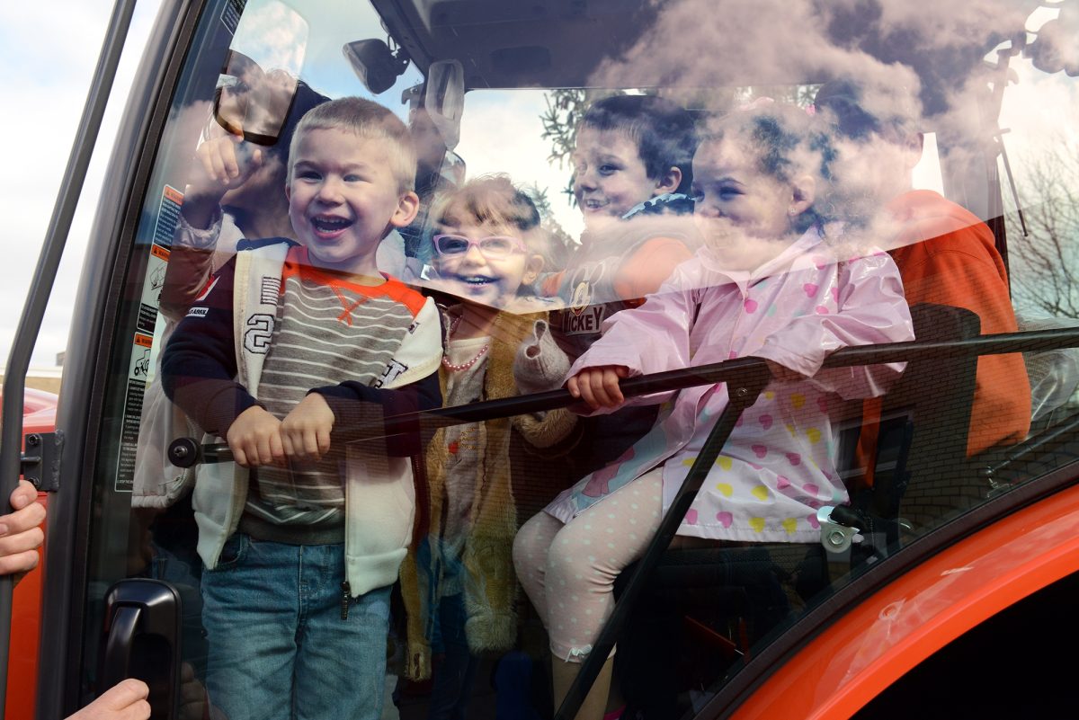Kennedy Howell, Braedin Carter, Rowan Tyrell, and Serenity Medlen join John Null from Rainbow’s End Learning Center in Washington for a turn inside the cab of a full-size tractor that visited the center Wednesday.