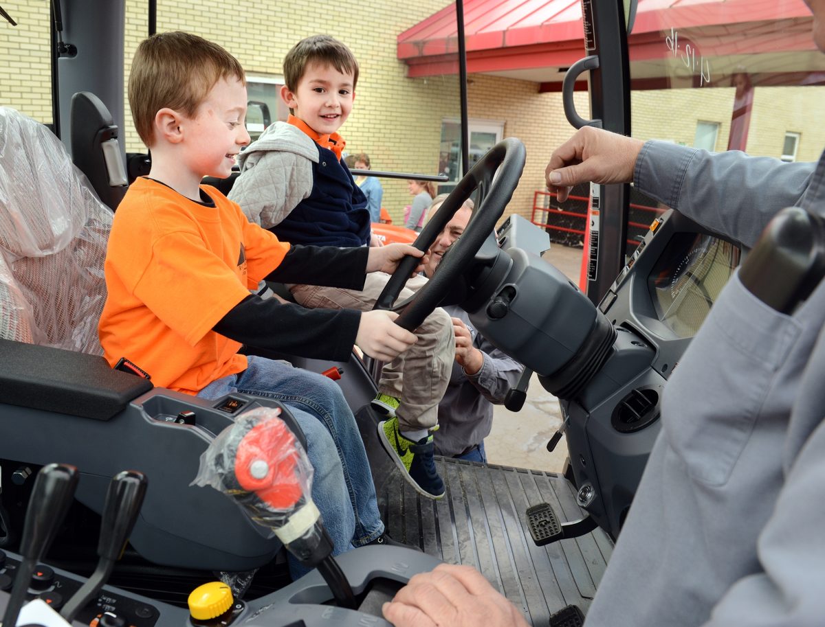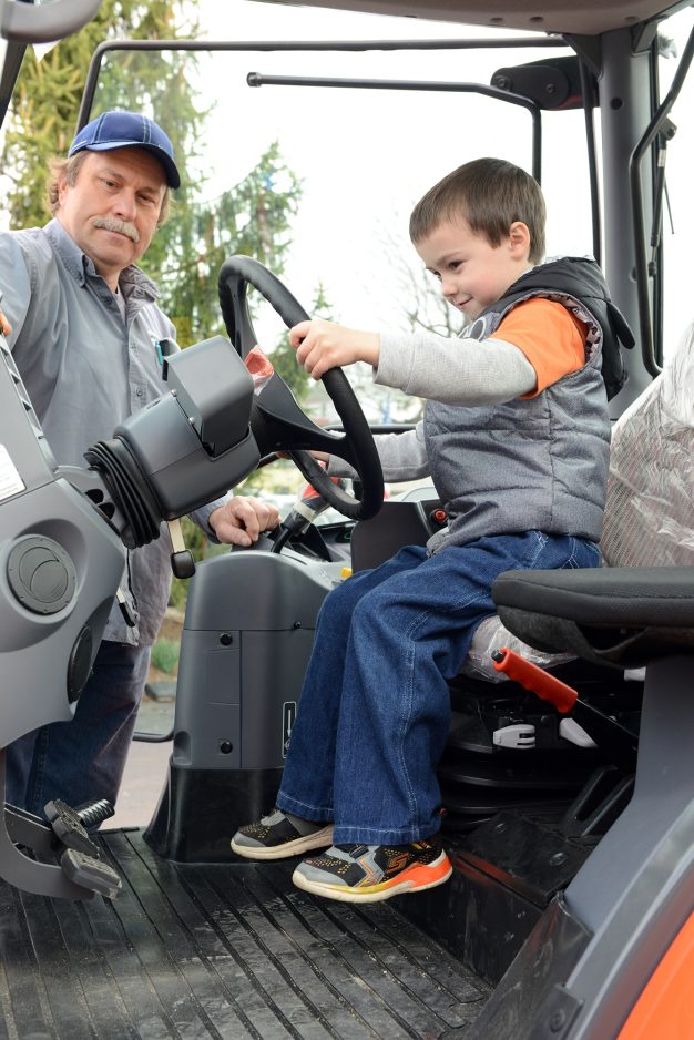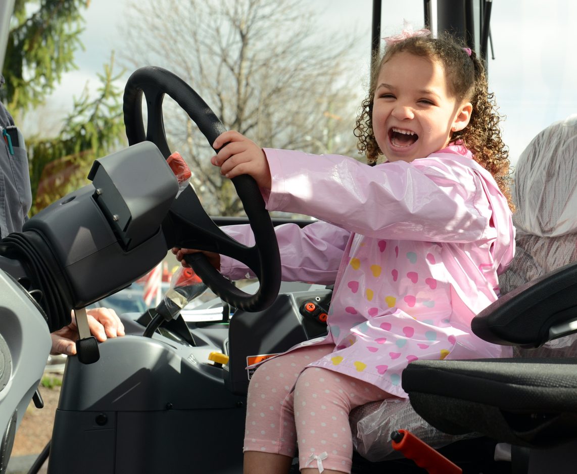 Tom Polen of Murphy Family Inc. supervises as Rowan Tyrell of Rainbow’s End Learning Center takes a turn at the wheel of a full-size tractor that visited the center Wednesday.