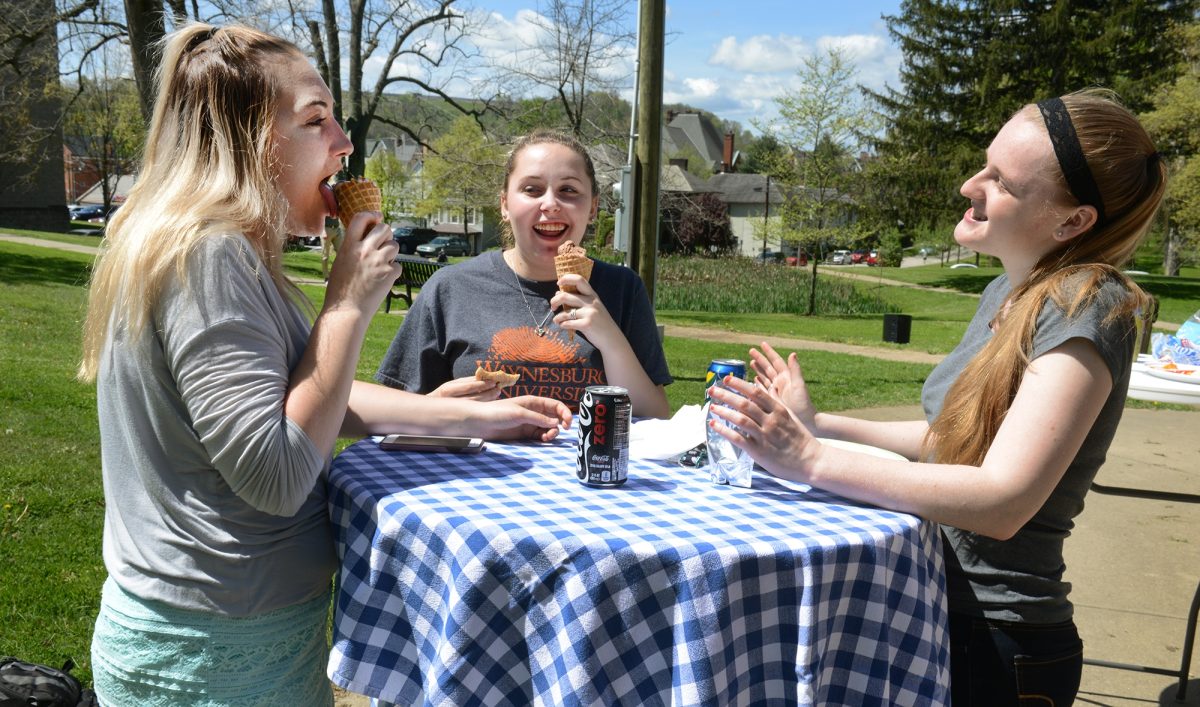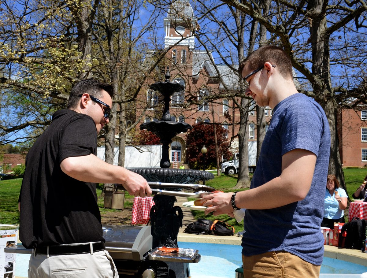Waynesburg University admissions counselor Matt McNeil serves up a thank-you lunch Wednesday last week to student ambassador Matt McDermott on the lawn in front of Miller Hall. Waynesburg held its commencement last weekend. McDermott plans to attend Princeton Theological Seminary in the fall.