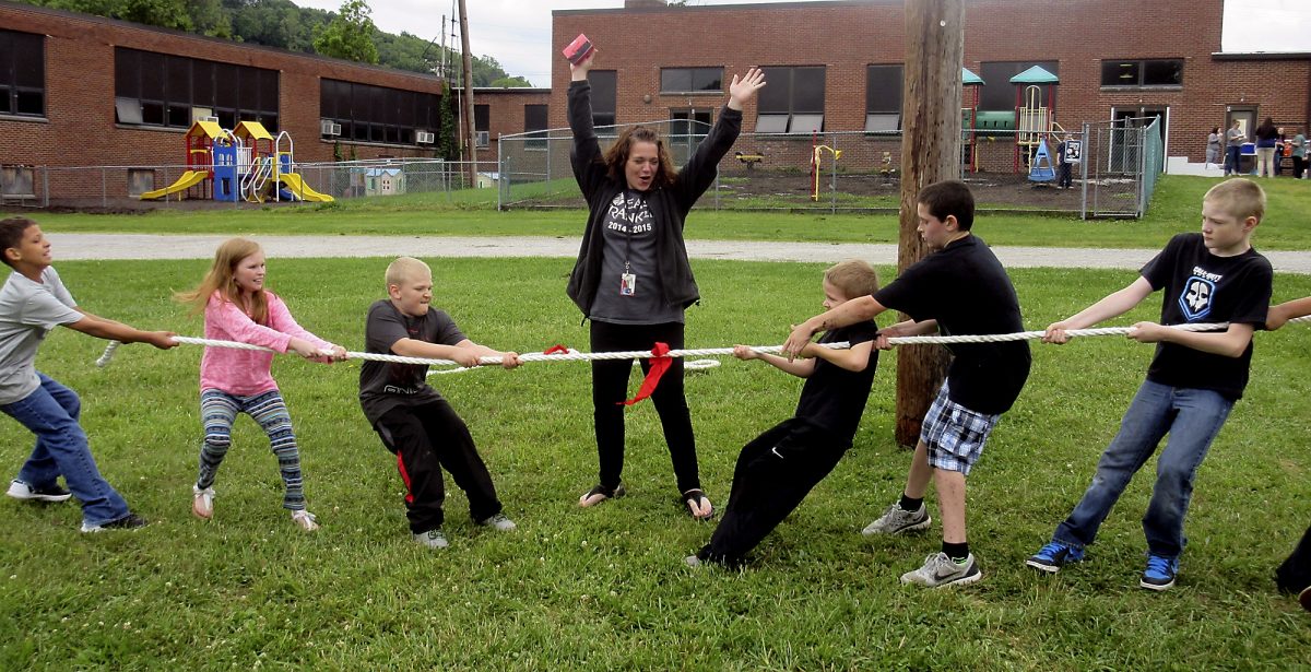 Social worker Lori Shealey, center, oversees a round of tug-of-war among elementary students during a carnival Friday at Greene County’s Intermediate Unit 1 school in Franklin Township. The carnival was part of the school’s celebration of the end of the school year.