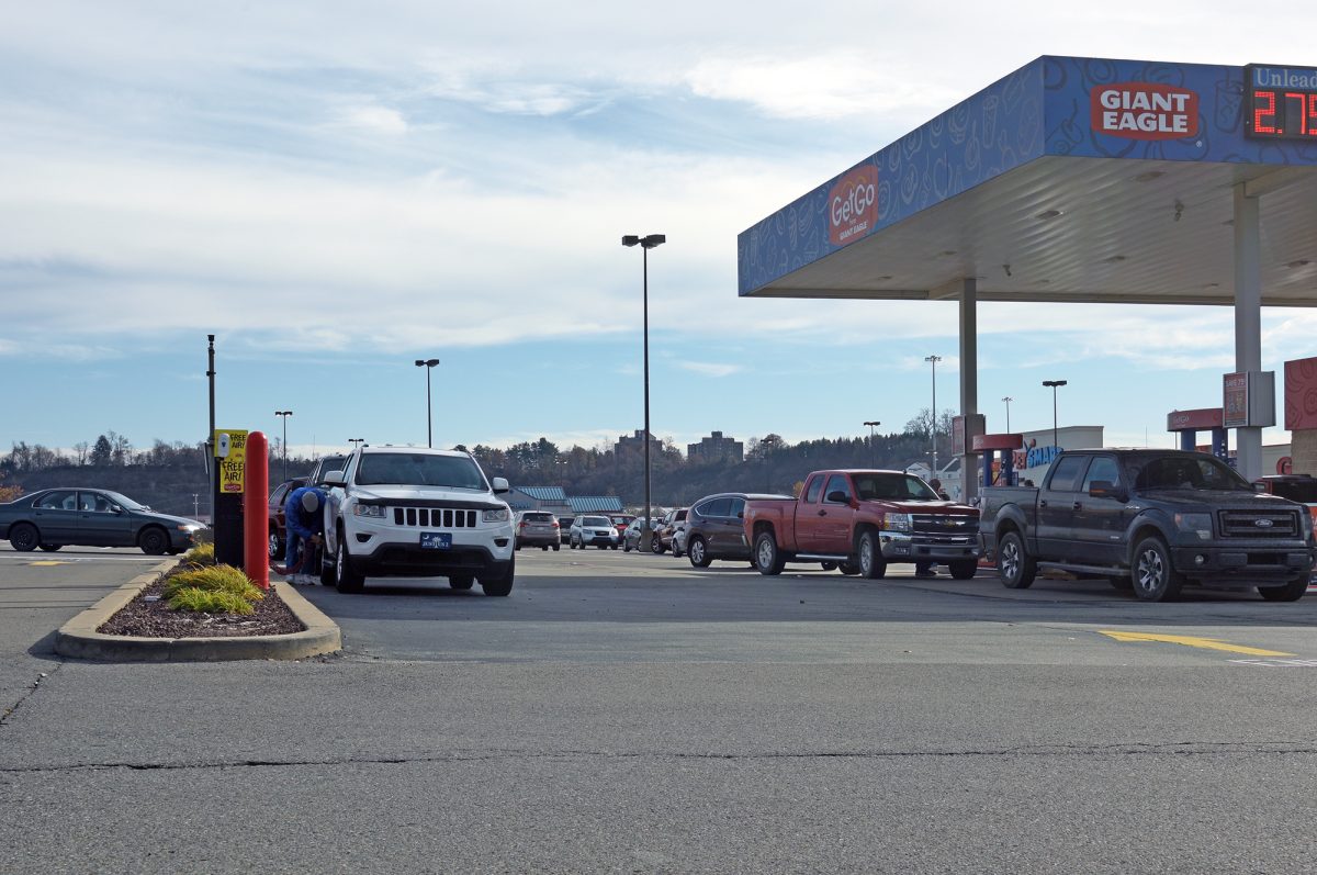 Vehicles line up for gas at the Giant Eagle GetGo at Strabane Square in South Strabane Township as the official Thanksgiving holiday travel period began Tuesday.