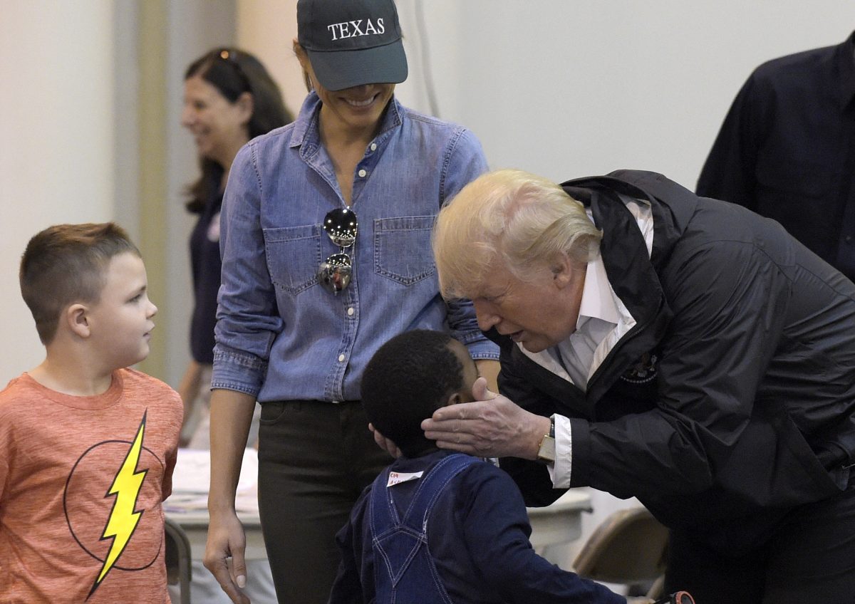 Joined by first lady Melania Trump, the president went directly to the NRG Center and was greeted warmly by volunteers and children. The Trumps brought coloring books and crayons and sat with families that had been displaced. Trump lifted one little girl into his arms and gave her a kiss. He signed his name on the cement wall by the children’s artwork.