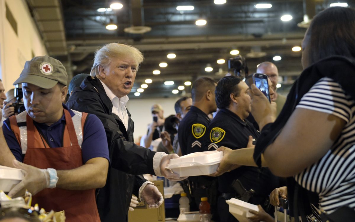 HOUSTON – President Donald Trump cupped a boy’s face in his hands and then gave him a high-five. He snapped on latex gloves to hand out boxed lunches of hot dogs and potato chips. And he loaded relief supplies into vehicles, patted storm victims on the shoulder and declared the work “good exercise.”
