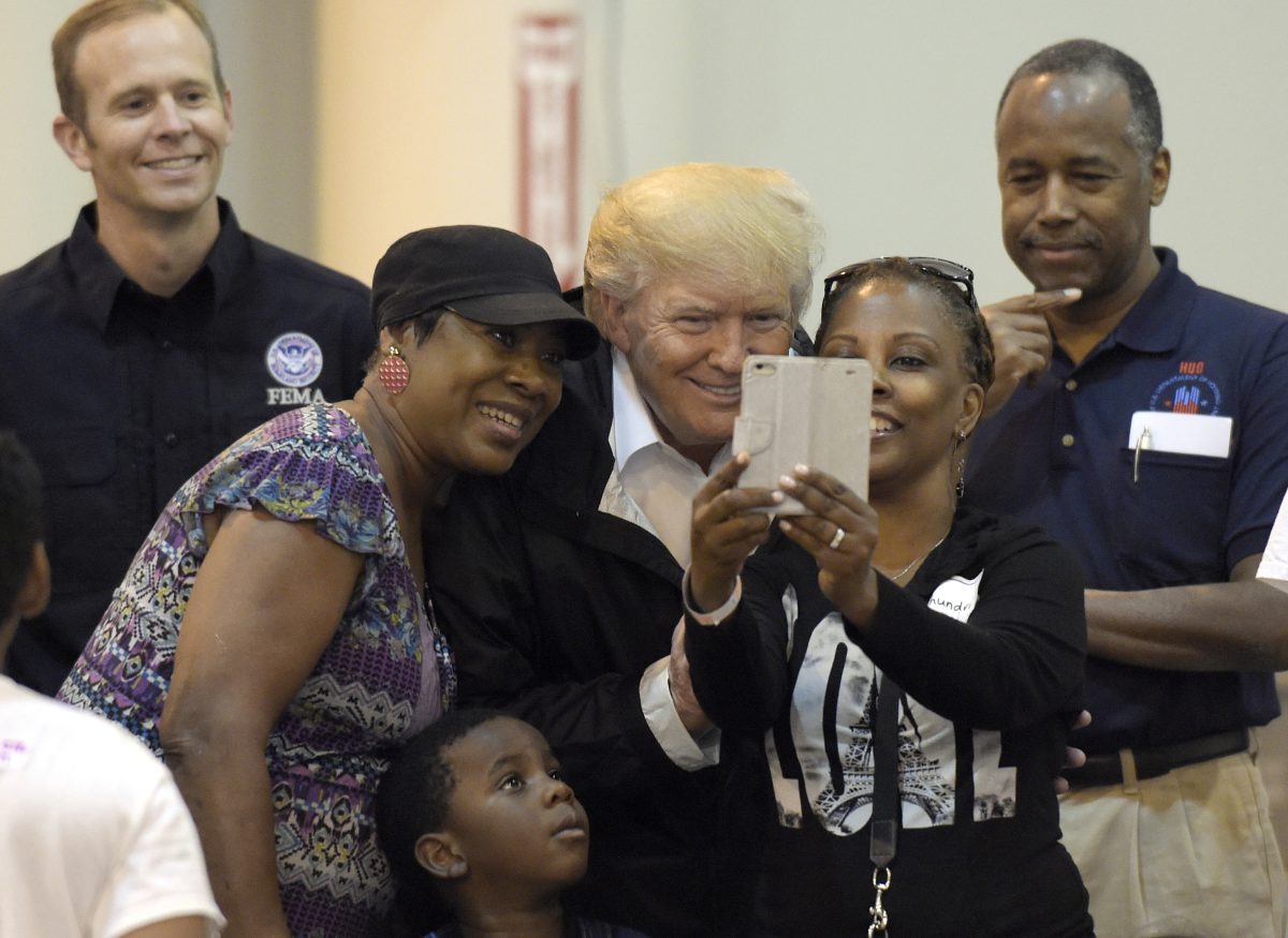 An upbeat and optimistic president visited with victims of Harvey Saturday, touring a Houston mega-shelter housing hundreds of displaced people and briefly walking streets lined with soggy, discarded possessions. Trump met the scene with positivity, congratulating officials on an emergency response still in progress and telling reporters he’d seen “a lot of love” and “a lot of happiness” in the devastation the storm left behind.