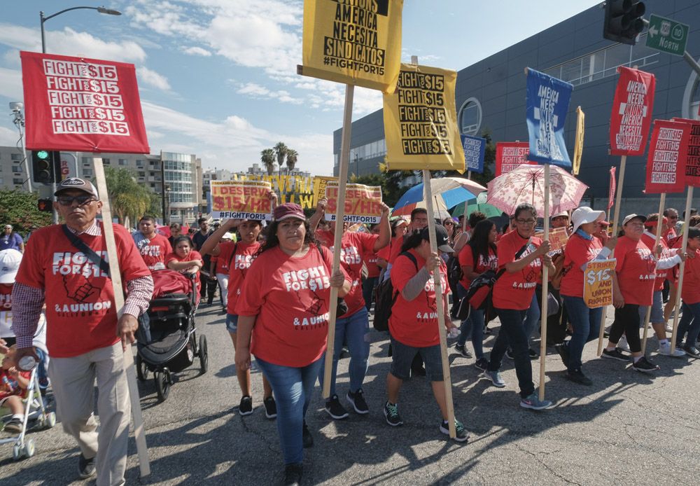 Hundreds of people marched through downtown Los Angeles on Monday, calling for a $15-an-hour minimum wage nationwide and stronger union protection for workers.