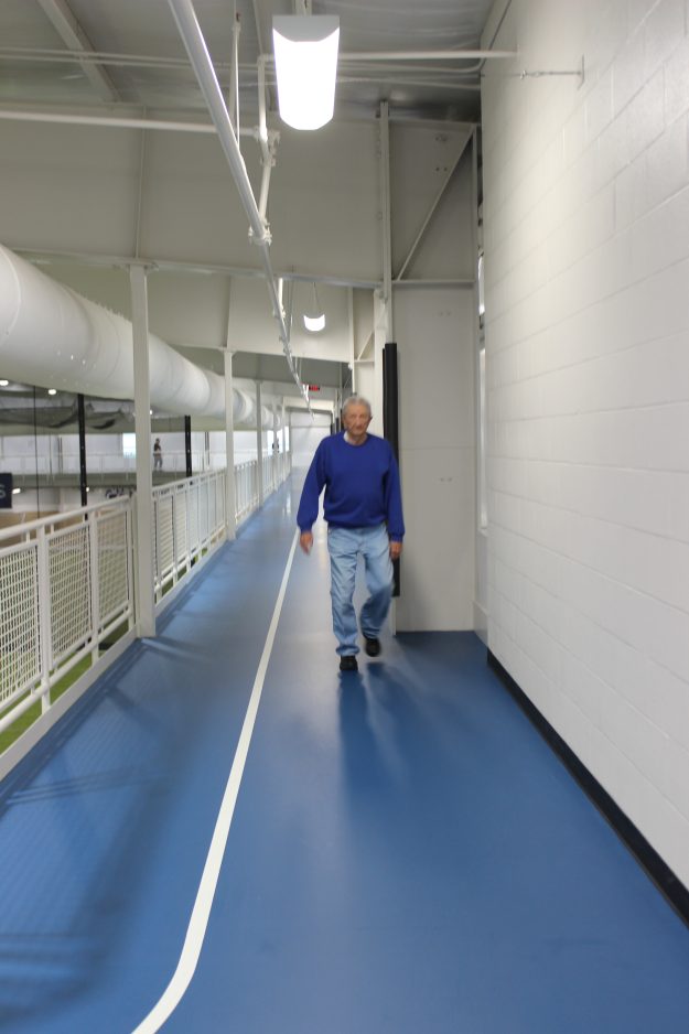 Bill Brown, of Waynesburg, walks on the elevated track that surrounds the indoor soccer field at the EQT REC Center.