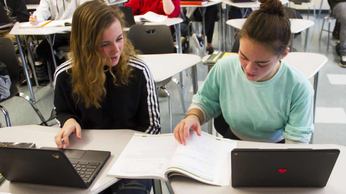 Bethel Park High School students Katelyn Eder and Amelia Gorman research the vital role of honeybees in U.S. agricultural production.