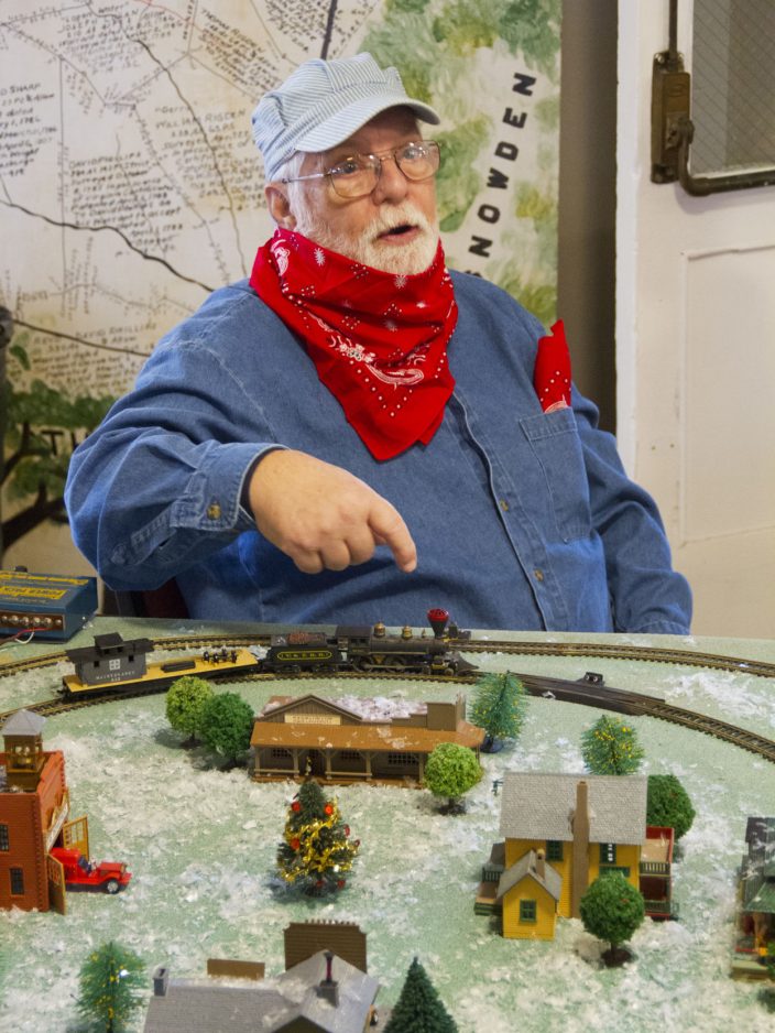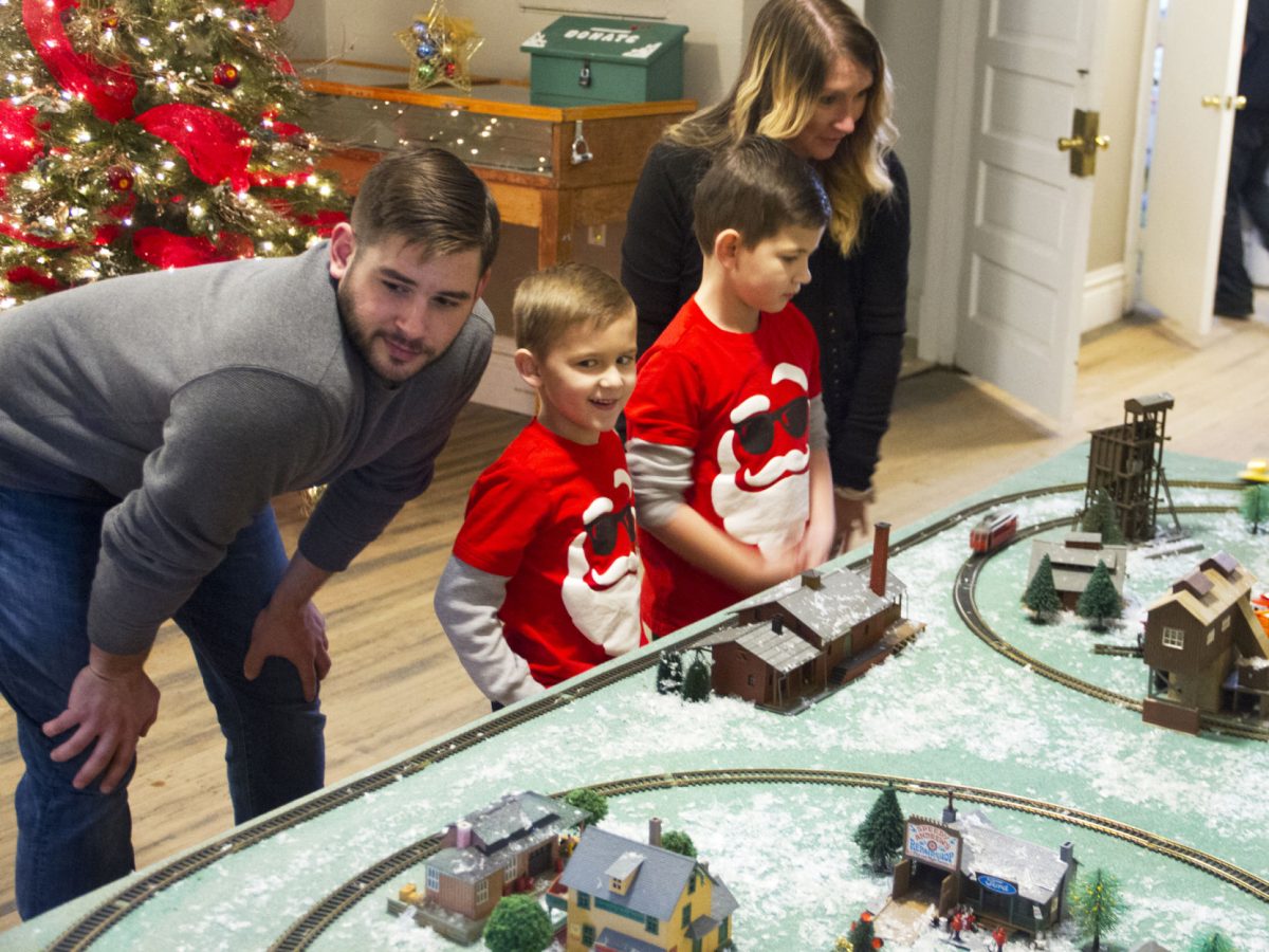 Checking out the model railroad display set up at the Schoolhouse Arts and History Center are Mark Fortunato, Channing Yesionek, Christian Yesionek, Krista Yesionek.